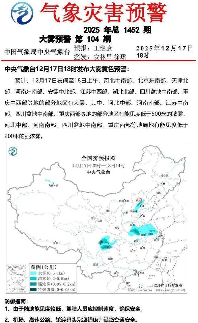 预计,12月17日夜间至18日上午,河北中南部、北京东南部、天津北部、河南东南部、安徽中北部、江苏中西部、湖北北部、四川盆地中南部、重庆中西部等地的部分地区有大雾,其中,河北中部、河南南部、江苏中南部、四川盆地中南部、重庆西部等地的部分地区有能见度低于500米的浓雾,河北中部、河南南部、四川盆地中南部、重庆西部等地局地有能见度低于200米的强浓雾。防御指南:1.由于陆地能见度较低,驾驶人员应控制速度,确保安全。2.机场、高速公路、轮渡码头采取措施,保障交通安全。